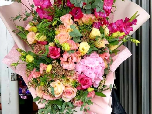 Buket-hortenzija, lizijantus, ljiljan,gladiola, eukaliptus