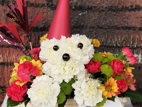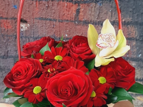 Cvetni aranžman korpa-ruže, margareta, orhideja