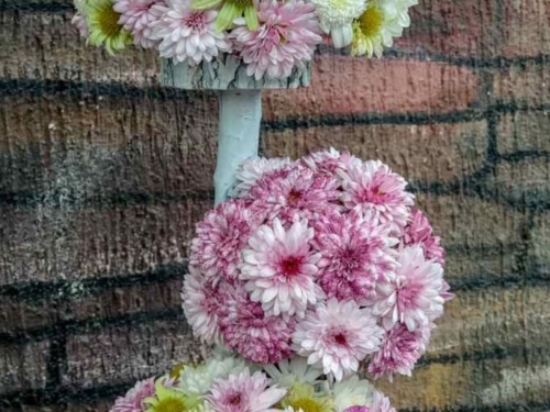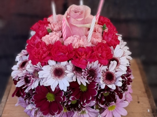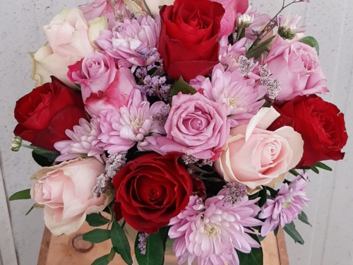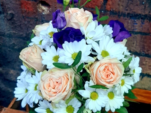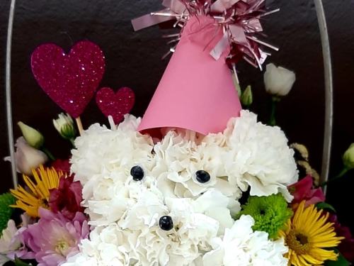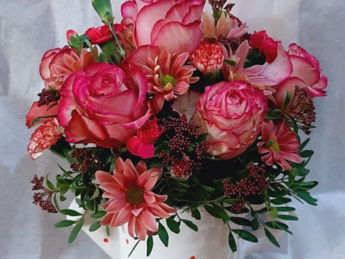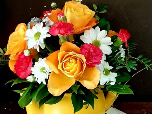 Aranžman u keramičkoj posudi-ruža, margareta,mini karanfil