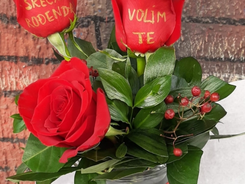 Cvetni aranžman u staklenoj posudi-ruže, margareta