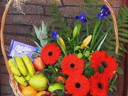 Aranžman korpa-voće, gerber,iris, ljiljan, margareta